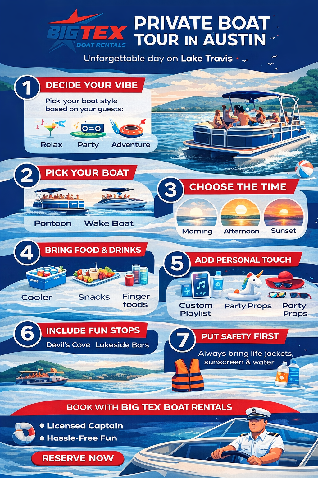 If you’ve never hosted a boat day before, you might feel overwhelmed. That’s where a service like Big Tex Boat Rentals makes it effortless. You can pick your boat, your time slot, and show up with your guests while they handle the rest. From providing a licensed captain to helping with ice and coolers, they’re used to making events run smoothly.
